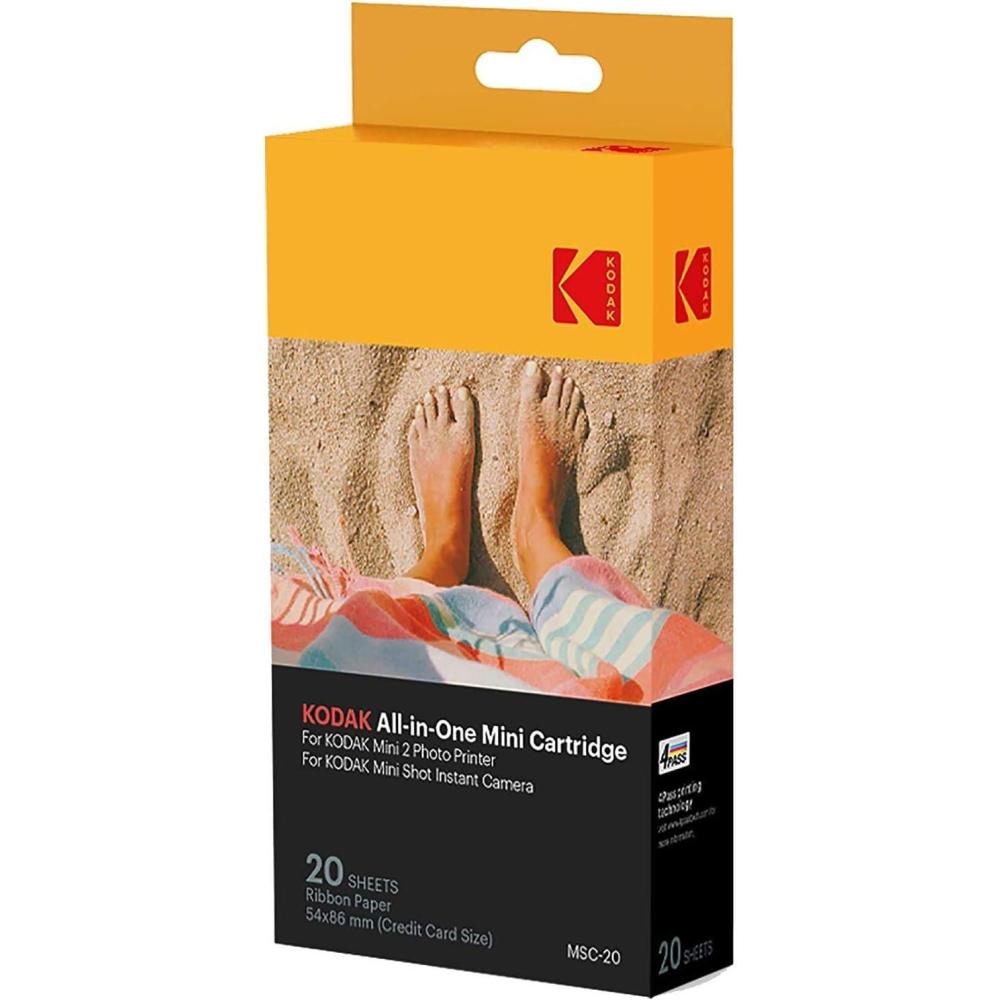 An all-in-one cartridge for all your printing pleasure! As a companion to the cutting edge Mini 2 & Mini Shot photo printer by Kodak, the Photo Printer Mini Cartridge MC brings you pro quality printing technology in a small but powerful package. Innovative 4PASS D2T2 dye transfer diffuses color in stages, layering yellow, magenta, and cyan hues for an incredibly brilliant effect. Perfect for printing color portraits, natural landscapes, stickers, and more, this fast, efficient cartridge is also noted for its mess-free design. Simply pick your choice of 20, 30, or 50 photos, pop in the unit, and watch your images come to life with meticulous accuracy of line, color, and texture. With an extra fade-proof overcoat and humidity resistance, you’ll enjoy your mini masterpieces for many years to come! Real Ink. In an instant. . The KODAK cartridge leverages patented 4Pass printing technology, also known as dye-sublimation, resulting in beautiful, high-quality prints. It features the world’s smallest 4Pass all-in-one cartridge for carrying convenience and unmatched quality. What You Get 1 Photo Printer Mini Cartridge by Kodak Your choice of 20, 30, or 50 photo capacity Black and white, color, and paper all-in-one Dye diffusion transfer for exceptional clarity and quality Specs & Details Model numbers: MC-20, MC-30, MC-50 All-in-One Black/White & Color Integrated photo paper Humidity resistant Fingerprint resistant Fade proof up to 10 years