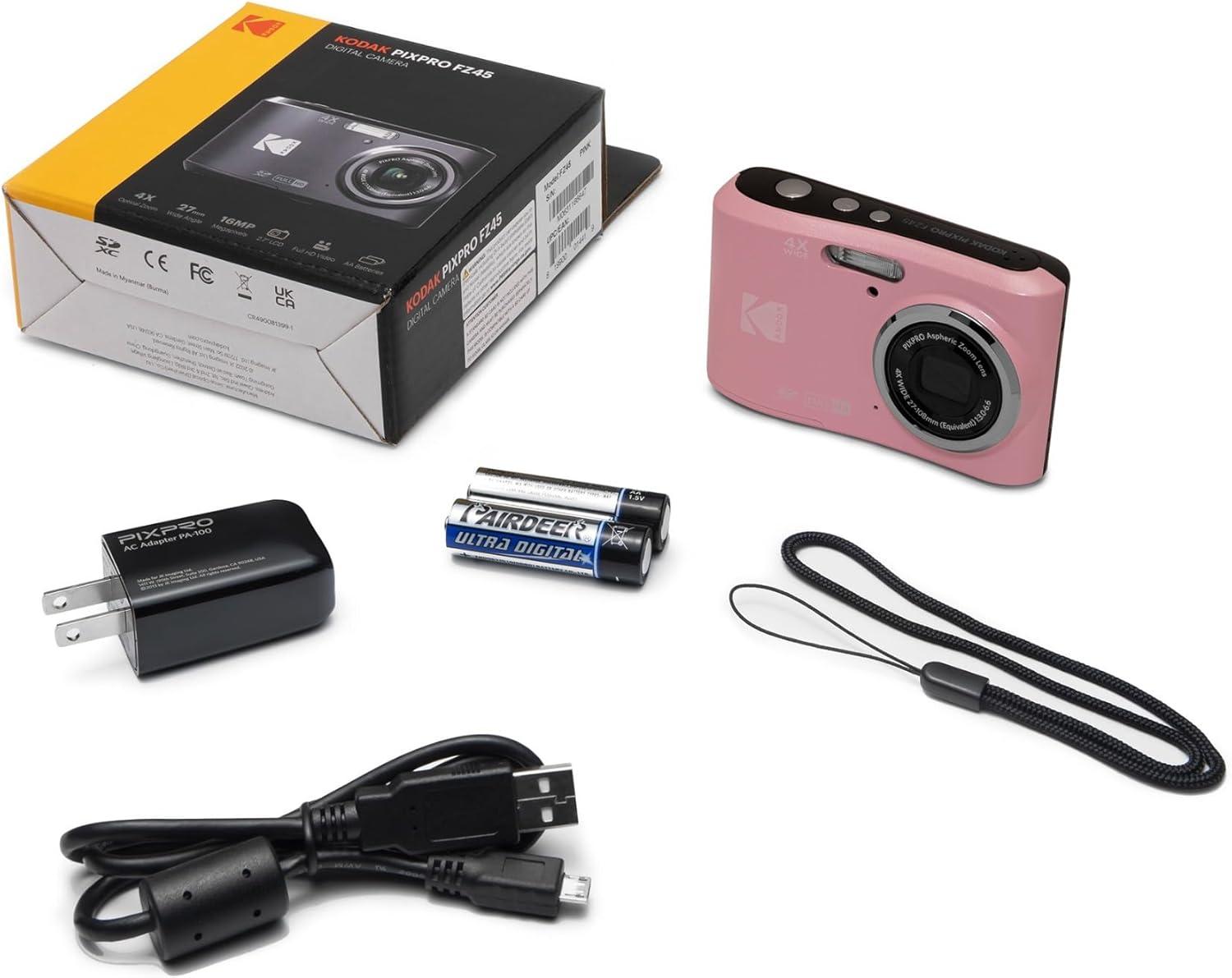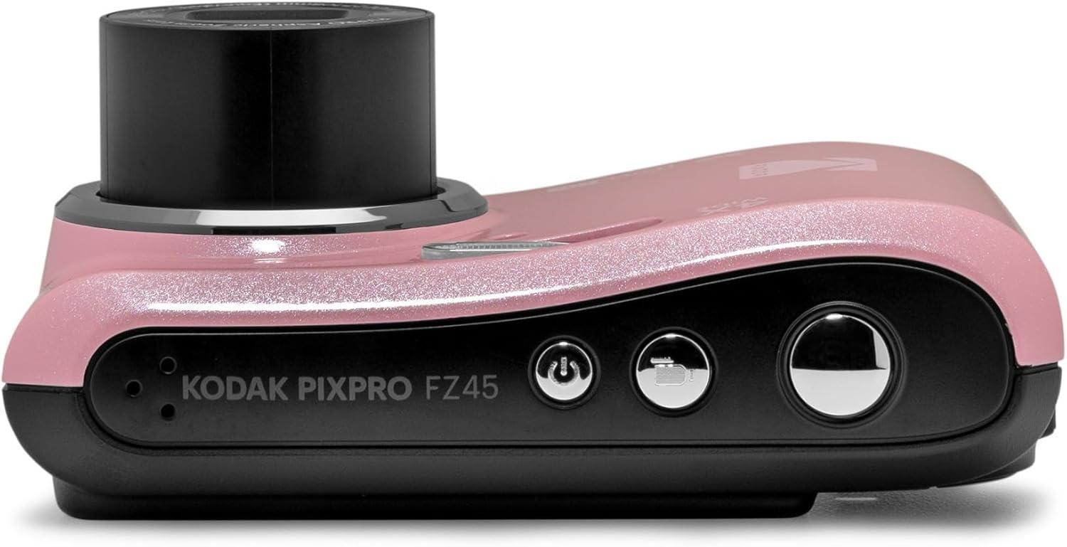 Kodak PixPro FZ45 Friendly Zoom 16MP 1080p Full HD Digital Camera (Pastel Pink) Capture clear photos and 1080p Full HD videos with the Kodak PIXPRO FZ45. This compact point-and-shoot features a 16MP CMOS sensor, 4x optical zoom, 27mm wide-angle lens, and a bright 2.7″ LCD—all powered by easy-to-replace AA batteries. 16MP CMOS Sensor Capture high-resolution images with vibrant color and fine detail, ideal for everyday photography and sharing. 4x Optical Zoom Get closer to your subject without losing image quality—perfect for portraits, landscapes, and casual zoom shots. 27mm Wide Angle Lens Fit more into every frame, whether it's a group photo or a scenic landscape, thanks to the wider field of view. 1080p Full HD Video Recording Seamlessly switch from stills to high-quality video capture with a dedicated one-touch button for full HD footage. 2.7-Inch LCD Display Preview and review your shots easily with the bright, clear screen that helps with framing and playback. AA Battery Powered Powered by two AA batteries for ultimate convenience—no need for charging cables or adapters while traveling. Face Detection & Red-Eye Removal Automatically detects faces and minimizes red-eye for more natural, flattering portraits. Easy Operation & Compact Design Designed for simplicity and portability, making it perfect for beginners or anyone wanting a no-fuss camera.