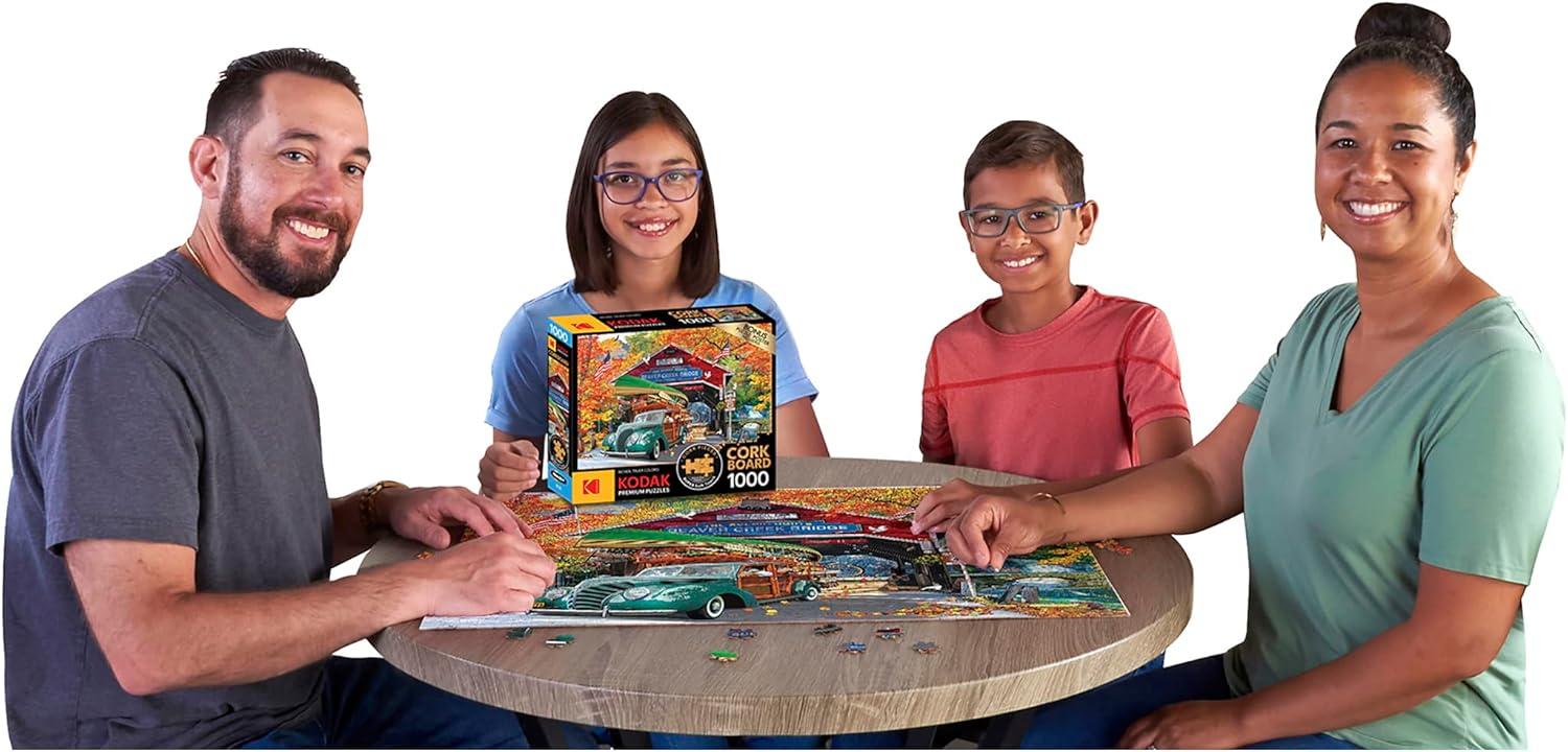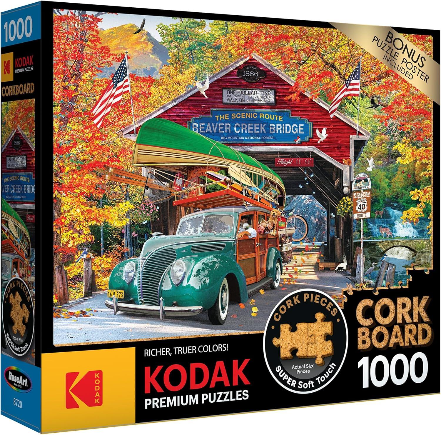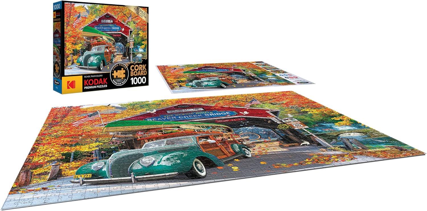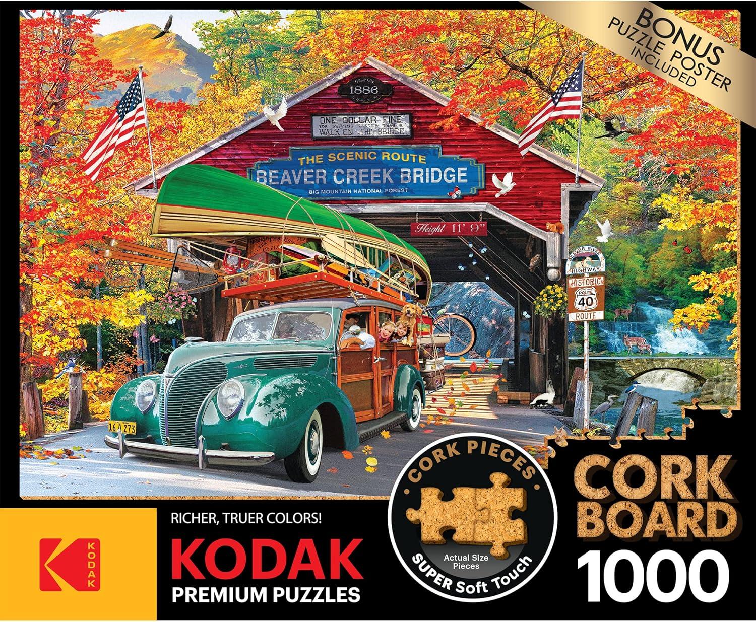 KODAK 1000pc Corkboard jigsaw puzzle “Covered Bridge” features a vintage woody stationwagon loaded for autumn vacationing fun. KODAK Premium puzzles represent the highest quality imagery and puzzles available today. These are the brightest, richest, most colorful puzzles. KODAK Corkboard puzzles feature fully interlocking soft fit pieces. The puzzles are durable and super satisfying to assemble. Bonus puzzle poster included.