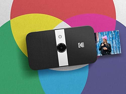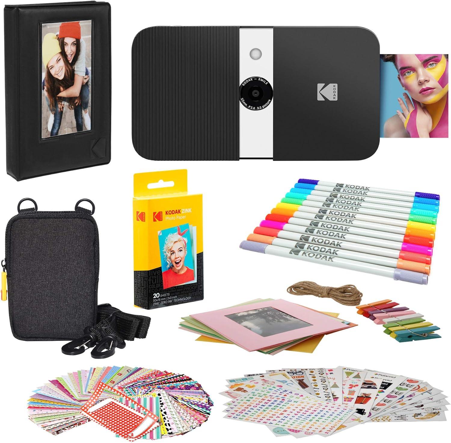 Spread a smile—in an instant! Tired of those bulky instant print cameras cramping your style? Shutterbugs no longer have to grin and bear it! With the new Smile Instant Print Digital Camera from KODAK you can snap, edit and share photographs anytime, anywhere, and in totally discreet fashion. For the first time, our portable camera/printer slides open from its compact state to reveal a powerful 8mm lens. Use the LCD viewfinder to zoom in, let the fixed focus work its magic, and capture the scene with incredible color and HD clarity. Editing features also let you apply flattering filters and other effects before printing. The Smile’s joyful design includes a durable case in a variety of cool color combinations. Other conveniences include a built-in strap slot; MicroSD card reader; touch control panel; easy LCD navigation; 2 picture modes; preview feature; automatic flash; and a rechargeable battery with up to 40 prints per charge. Most importantly, the camera’s instant printer uses innovative zero ink technology—no film or cartridges required. Load the 2×3 ZINK photo paper (starter set included) into the device to print on the spot. It’s time to turn that frown upside down. Add the KODAK Smile to your cart today! What You Get 1 x Smile Instant Print Digital Camera from KODAK 1 x USB cable 1 x ZINK Zero Ink paper starter pack Quick start guide A pocketful of snappy sunshine! Specs & Details Camera sensor: 5mp Max resolution: 10MP by interpolation Lens: 8mm Color: black/white Compatible paper: 2”x3” ZINK zero ink How to Enjoy Use the quick start guide to get your Smile set up Keep the case closed to protect the lens for travel When ready to snap, slide open so it’s happy as a clam Take, edit and share your pics easier than ever Give an awesome gift for boys, girls and adults of all ages!